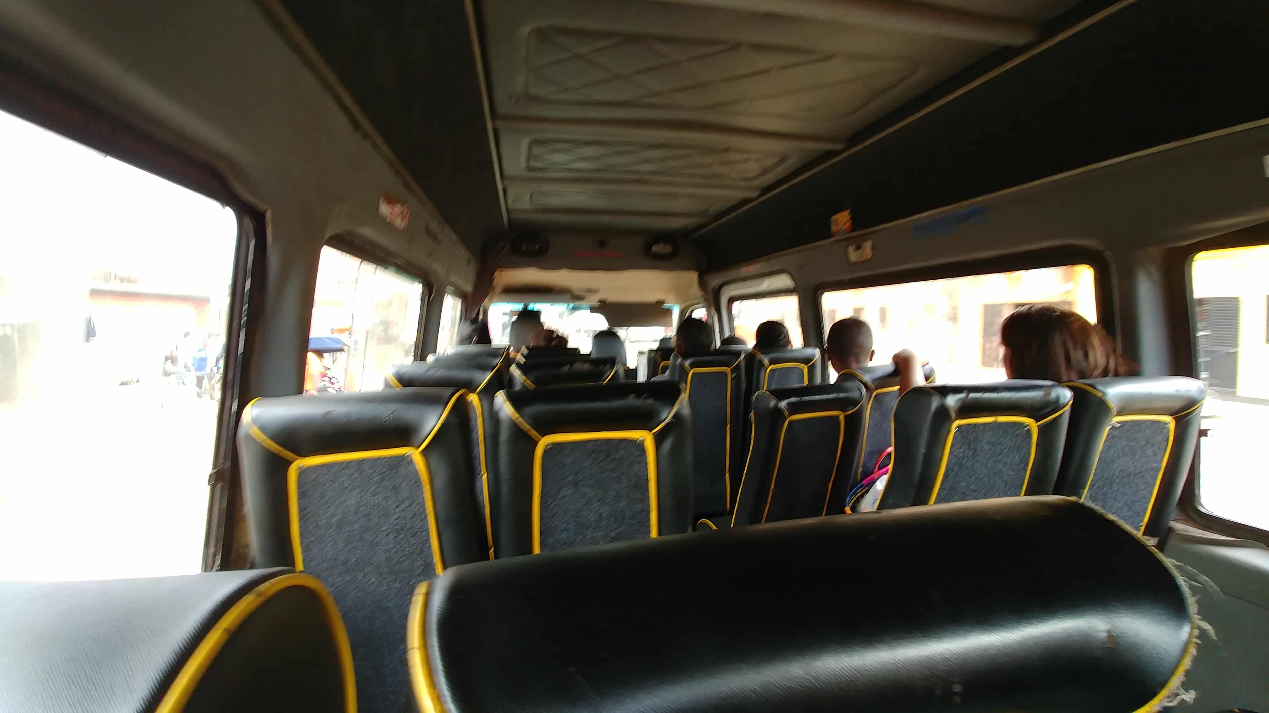 Le bus arrive. En France, on appellerait cela un minibus, mais ici c’est bel et bien un bus. Il y a toujours deux personnes par bus. Un conducteur et un caissier. Le caissier se trouve à l’arrière du bus, c’est par là que je monte. Je paye les 400 ARI qui sont nécessaires pour le trajet. Cela ne fait que 0,10 €, mais c’est déjà beaucoup d’argent pour la population. Pour ce que l’on peut appeler un « SMIC » cela représente 10 % du salaire journalier. Tout le monde ne peut pas se déplacer en bus. J’ai l’impression que cela surprend beaucoup les gens de voir un vazaha (un étranger) monter dans un bus malgache. D’habitude, les vazaha utilisent des voitures, ou plutôt des 4×4.
